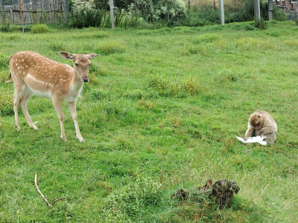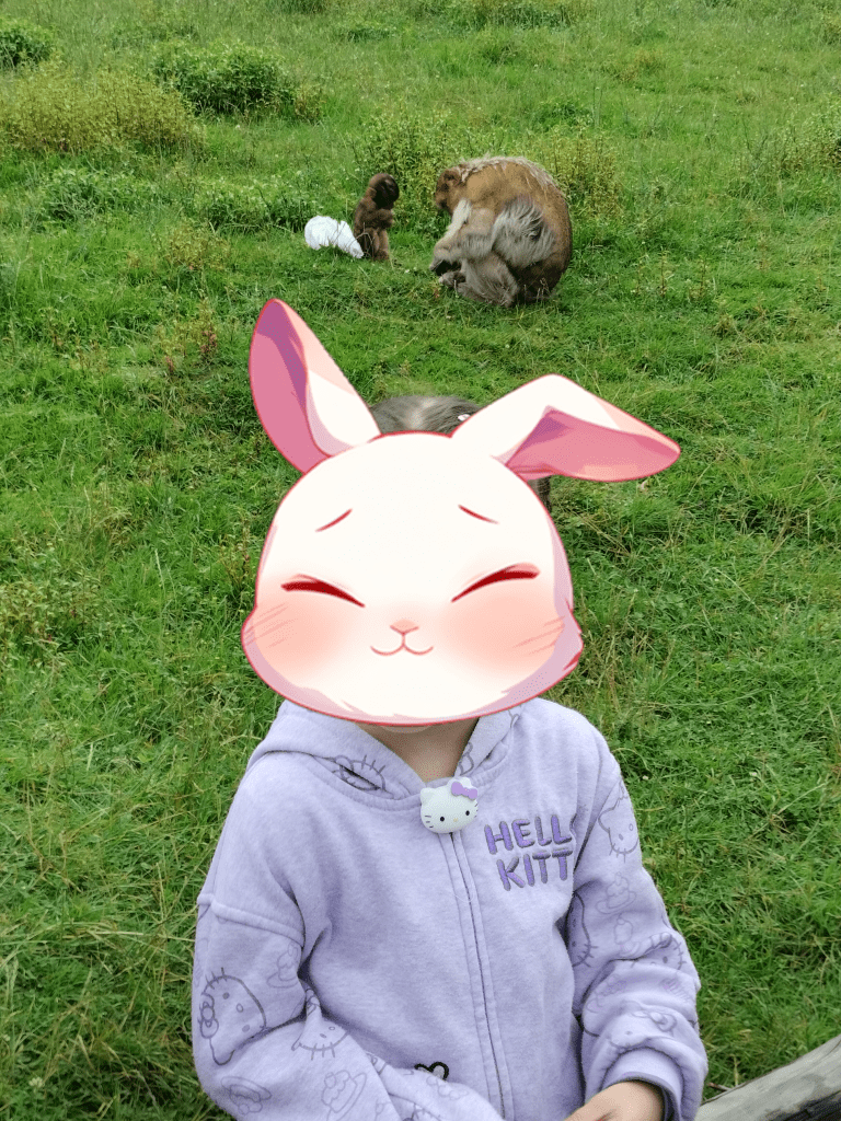 The rain didn’t stay long, so after we had our picnic, we headed on to the next section of the park – the monkeys! First we headed into the area with the smaller monkeys. They kept them with some deer, which I thought was cute. We were only allowed to pet the deer and no feeding anything in that enclosure. Next, we went into the big monkey enclosure that held the bigger monkeys. For that one, we had to leave our bags outside and we were warned to be careful of our phones and jewelry as the monkeys might steal them 😱 Those monkeys were allowed to be fed (with special food we could purchase there) but we did not feed them. They had told us at the entrance that it was better to just get goat food for smaller kids like baby bunny. And if you look at the pictures below, you can see that some monkeys have what looks like white papers they are eating. Well those are the paper bags. The monkeys have learned to wait by the entrance and will steal the whole bag from people who bring them in. They then carefully tear the bags open and enjoy their feast. Yes, we watched it happen 🐒